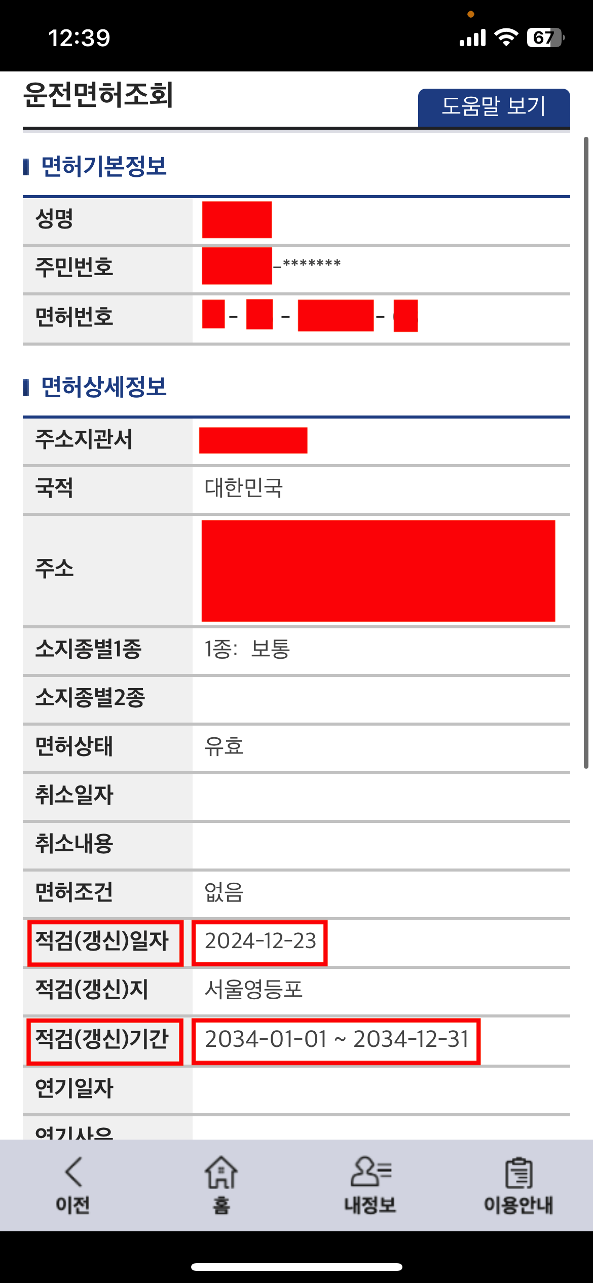 - 상단 왼쪽 메뉴 > 운전면허.조사예약 메뉴 > 운전면허 조회 로 들어가게 되면 운전면허에 대한 상세 정보를 볼 수 있습니다. 적성검사와 면허갱신한 날짜와 적성검사와 면허 갱신을 해야 하는 기간도 잘 나와있습니다.