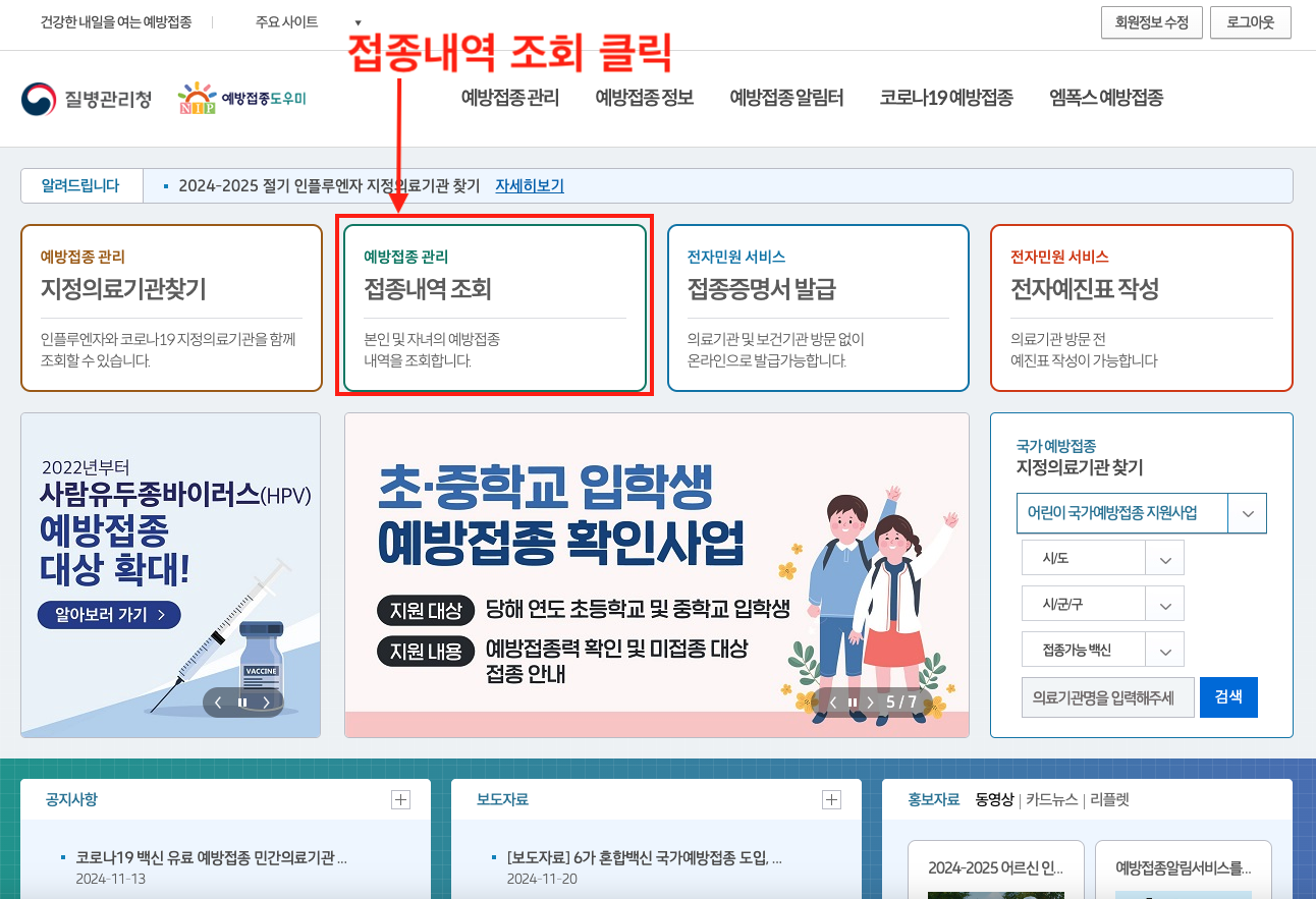 예방접종 내역조회 바로가기