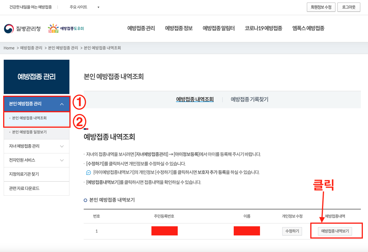 - 본인 예방접종 관리 > 본인 예방접종 내역조회