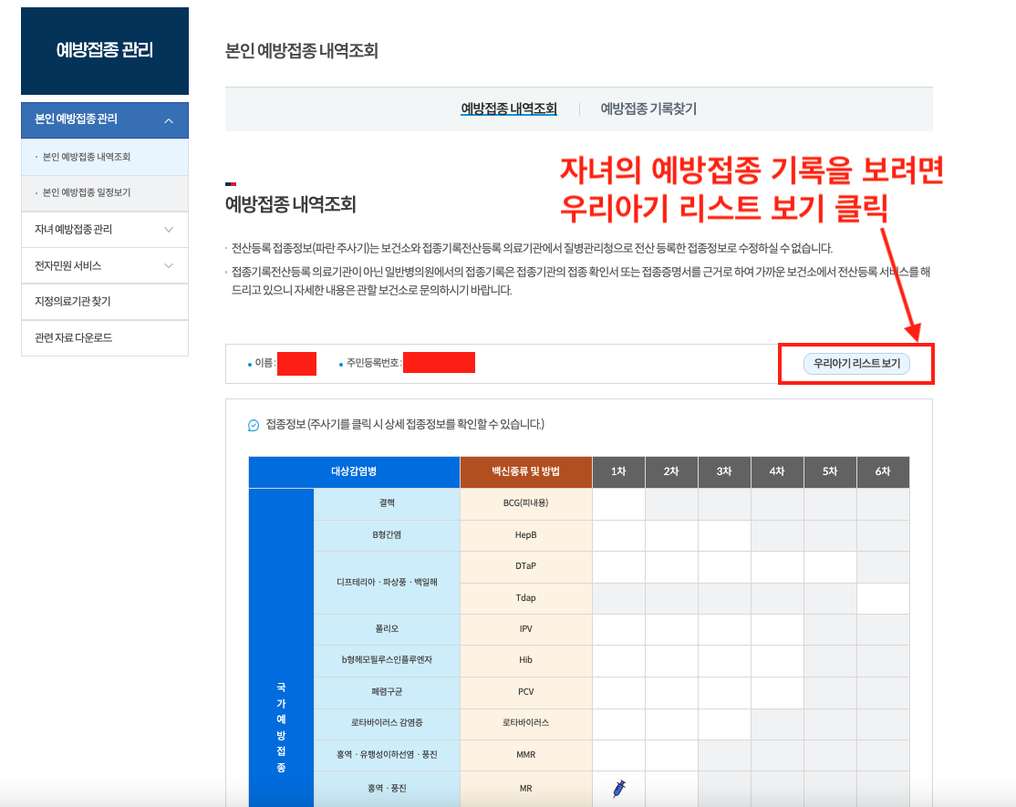 - 본인의 정보 옆에 우리아기 리스트 보기 버튼이 있는데 버튼을 누르면 자녀의 예방접종 내역을 확인할 수 있습니다.