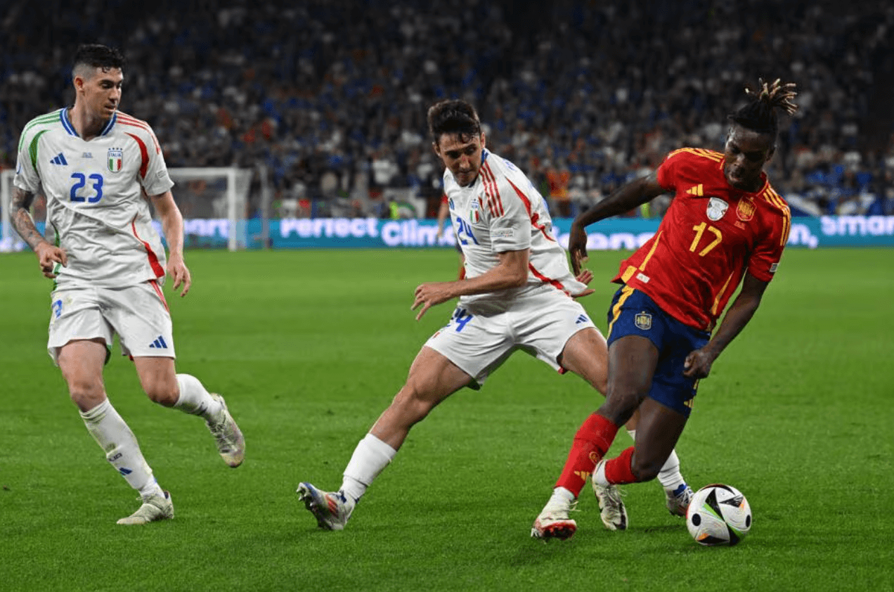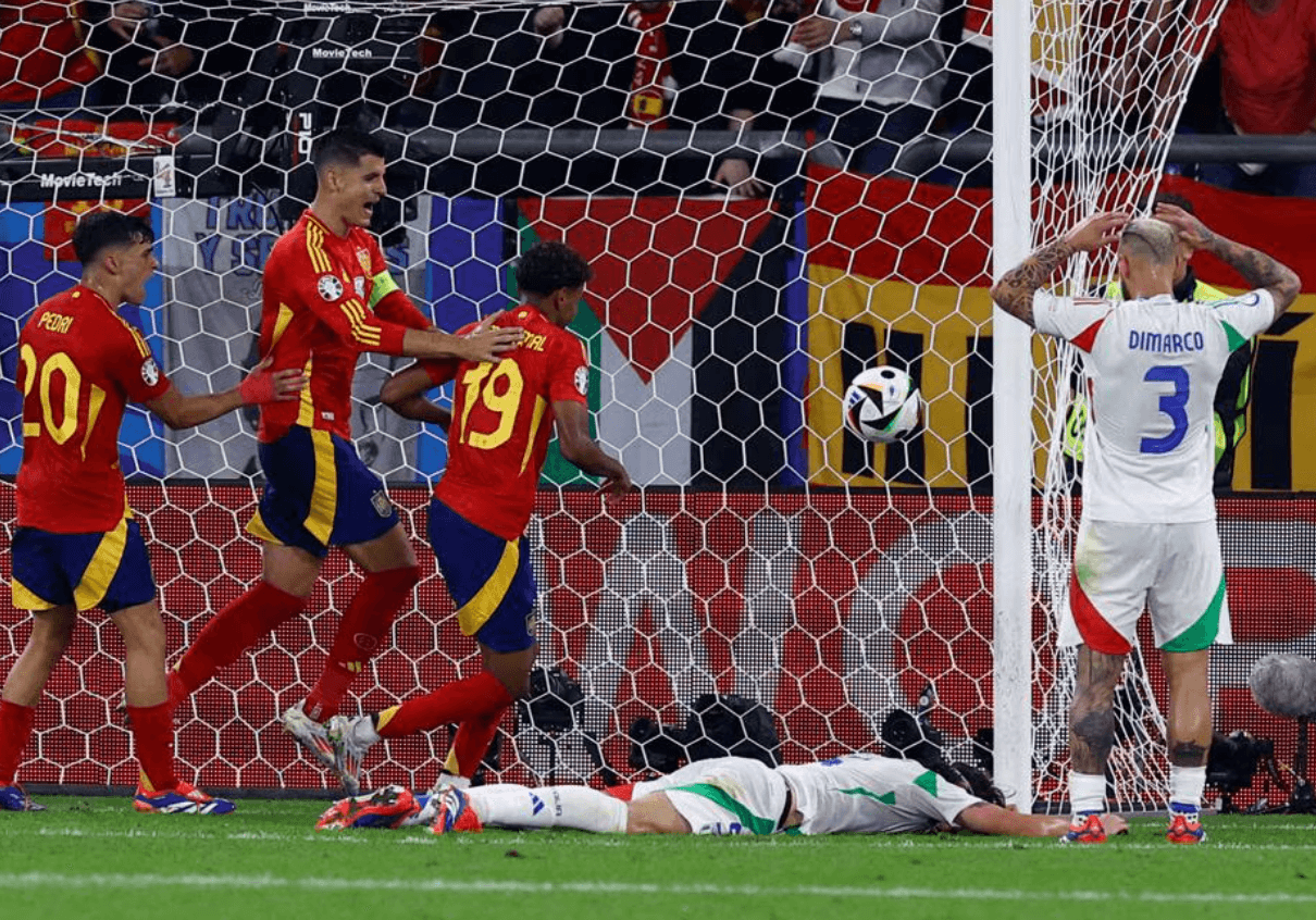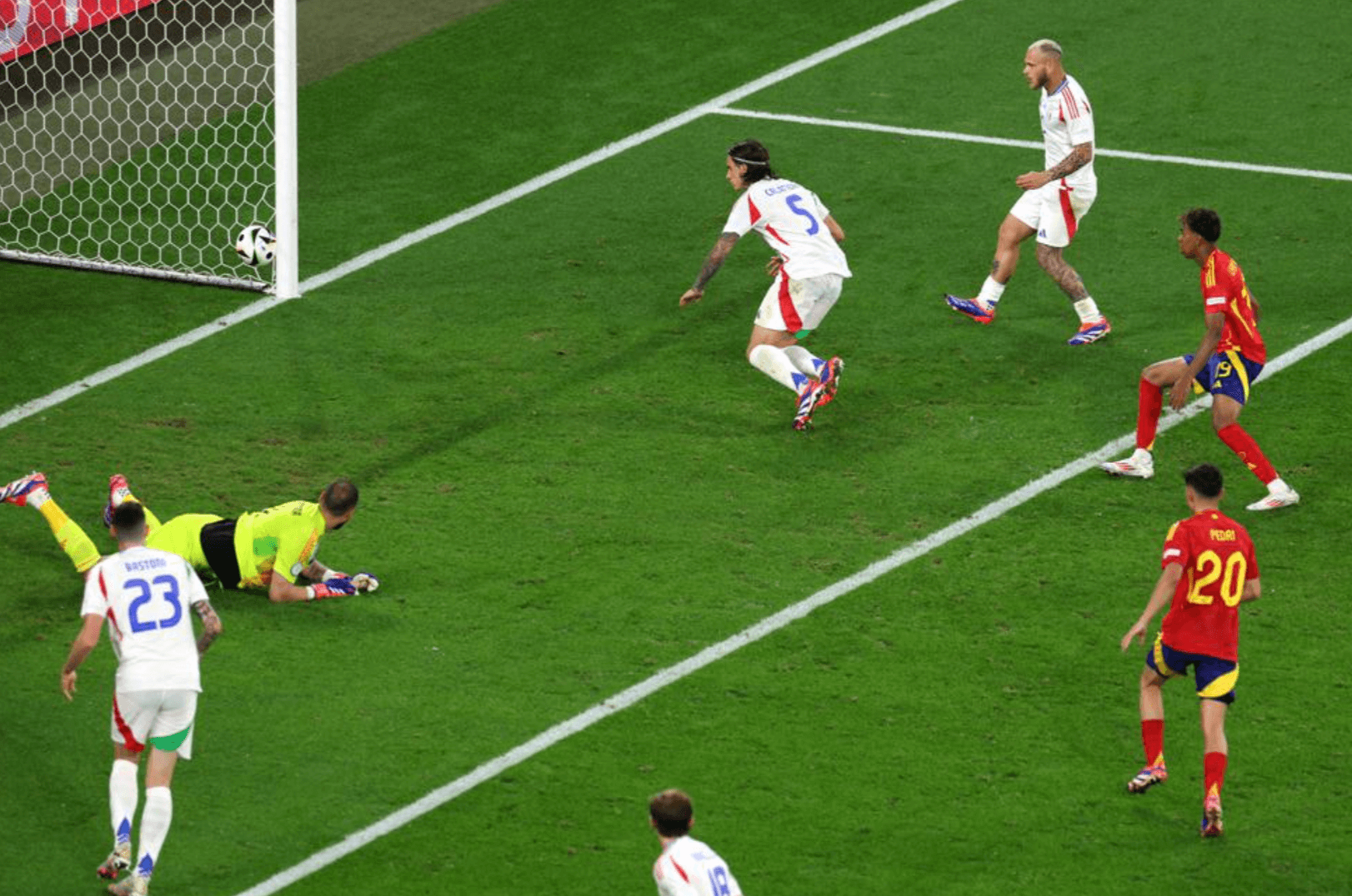 - 경기 초반부터 스페인은 특유의 점유율 축구를 통해 경기를 주도했습니다. 이탈리아는 강력한 수비와 빠른 역습을 통해 스페인의 공격을 차단하려 했습니다. 스페인은 페드리, 로드리, 파비안 루이스로 구성된 미드필더진이 중심을 잡고 경기를 이끌었습니다. 전반전 동안 스페인은 여러 차례 득점 기회를 만들었지만, 이탈리아의 골키퍼 잔루이지 돈나룸마의 선방에 막혀 득점에 실패했습니다. 돈나룸마는 여러 차례 결정적인 슈팅을 막아내며 팀을 구해냈습니다. 전반전은 득점 없이 0-0으로 마무리되었습니다. 후반전에도 스페인은 계속해서 공격을 이어갔습니다. 후반 10분, 스페인은 마침내 결승골을 기록했습니다. 알바로 모라타의 헤더를 돈나룸마가 걷어내려다 이탈리아의 센터백 리카르도 칼라피오리의 발을 맞고 자책골로 이어졌습니다. 이 골로 스페인은 1-0으로 앞서 나갔습니다. 이탈리아는 동점골을 위해 반격에 나섰지만, 스페인의 견고한 수비와 골키퍼 우나이 시몬의 선방에 막혀 득점에 실패했습니다. 스페인은 후반전 내내 경기를 주도하며 이탈리아의 공격을 효과적으로 차단했습니다. 경기 종료 휘슬이 울리면서 스페인은 1-0 승리를 거두었고, 이 승리로 2연승을 기록하며 승점 6점으로 조 1위를 확정지었습니다. 스페인은 이번 승리로 16강 진출을 확정지었으며, A조의 독일에 이어 두 번째로 토너먼트 진출을 확정한 팀이 되었습니다. 반면, 이탈리아는 1승 1패로 승점 3점을 기록하며 B조 2위에 머물렀습니다. 이탈리아는 이번 경기에서 스페인의 압도적인 점유율과 공격력에 고전했으며, 자책골로 인해 패배를 기록한 점이 아쉬움으로 남았습니다. 이번 경기는 스페인의 전술적 우위와 이탈리아의 수비력 간의 대결이 돋보였습니다. 스페인은 경기 내내 높은 점유율을 유지하며 경기를 주도했고, 이탈리아는 강력한 수비와 골키퍼의 선방으로 맞섰습니다. 그러나 결국 자책골로 인해 승부가 갈렸습니다.