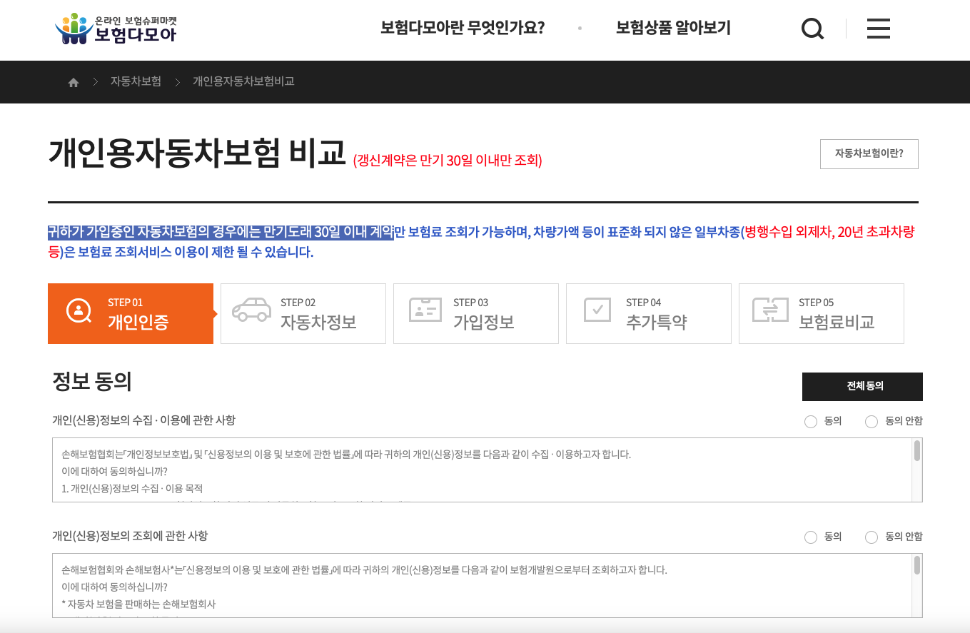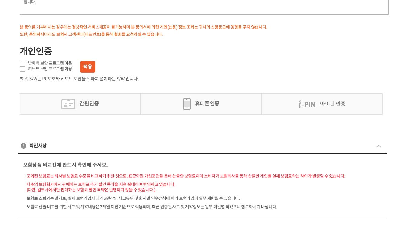 - 개인용 자동차보험 비교의 정보동의와 개인인증을 통하여 자동차보험 다이렉트 비교견적을 계속 진행합니다.