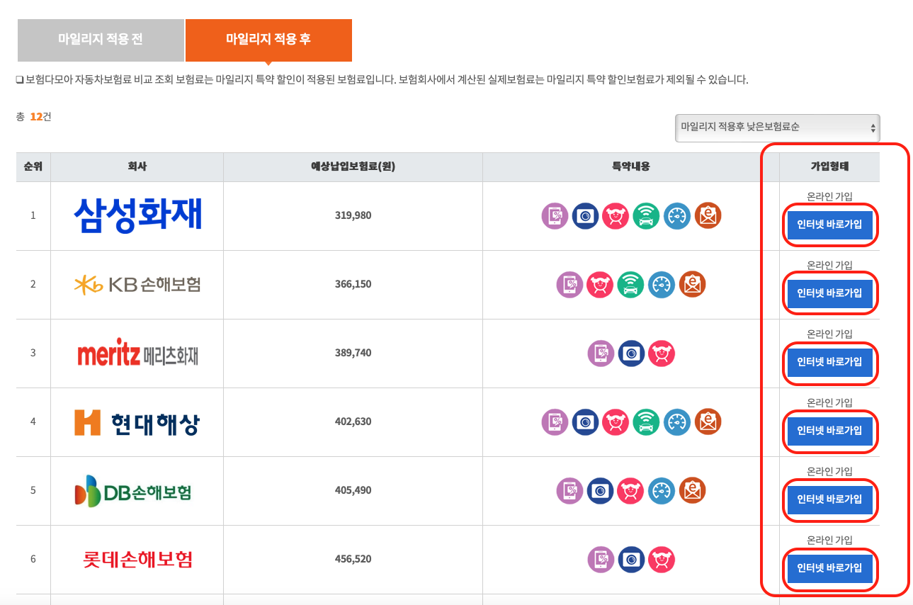 - 추가특약까지 선택을 해서 자동차보험 다이렉트 비교견적을 잘 진행했다면 마지막으로 보험료를 비교하여 결과를 알려줍니다. 결과 화면을 통해서 여기 보험에 제일 싸네 하고 보험사에 전화해서 가입을 한다면 결국 수수료가 붙게 되어 지금까지 진행한 자동차보험 다이렉트 비교견적의 의미가 없어지므로, 제일 오른쪽에 있는 인터넷 바로가입 버튼을 클릭해서 해당 보험사의 자동차보험 다이렉트 가입을 진행해야 합니다. 보험사의 혜택이 다를 수 있으므로 1,2개 정도는 비교를 해보고 가입하는 것을 추천합니다.